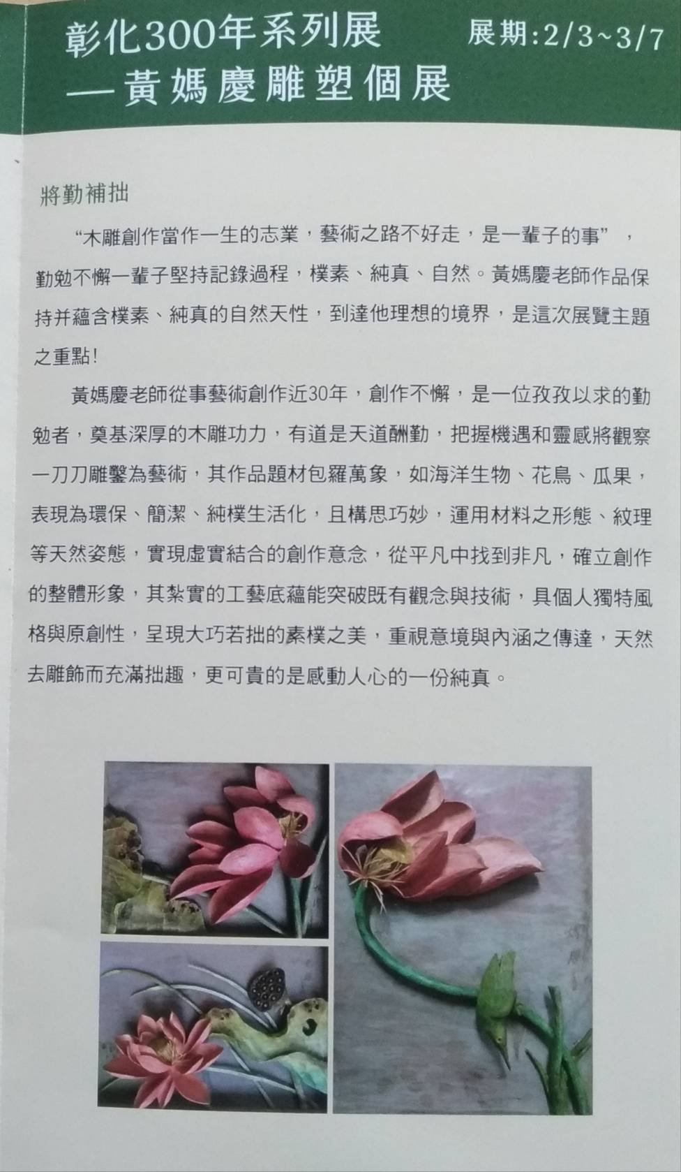 彰化300年系列展-黃媽慶雕塑個展 Super User 本站新聞 11 一月 2021 點擊數: 1203 列印 Email 展期:2021.2.3~3.7 週二~週日 AM9:00~PM17:00地點:彰化藝術館 (彰化市中山路二段542號) tweet